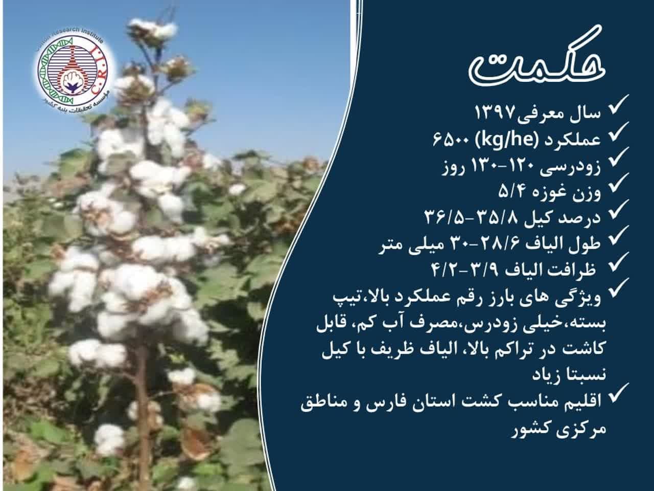رقم حکمت ۲۷ مهر ۱۴۰۴ | ۱۱:۲۶ معرفی ارقام تعداد بازدید:۲۷ سال معرفی: 1397 ویژگی (های) بارز رقم: عملکرد بالا تیپ بسته خیلی زودرس مصرف آب کم قابل کاشت در تراکم های بالا الیاف ظریف با کیل نسبتاً زیاد اقلیم مناسب کشت: استان فارس و مناطق مرکزی کشور